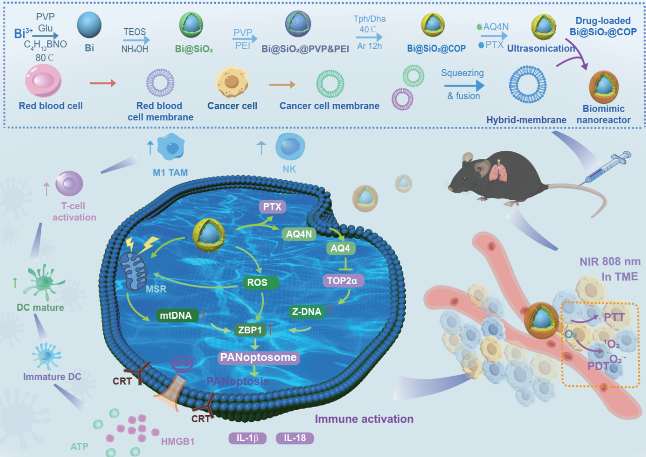 泛凋亡(PANoptosis)是一种整合了凋亡、焦亡和程序性坏死的剧烈的破膜性死亡方式,在增强抗肿瘤免疫领域具有较好的应用潜力。为了触发泛凋亡抗非小细胞肺癌,李西川教授团队创新性的设计并制备了一种可编程的仿生纳米反应器(BSCAPM);该纳米反应器以有机金属Bi为核心发挥光热活性,外层逐级包裹SiO₂层以诱导线粒体功能障碍、COP层以实现光动力和药物递送功能,并将经典化疗药物紫杉醇(PTX)和缺氧激活前药班诺蒽酮(AQ4N)共同装载到COP中,最后将红细胞膜与肺癌细胞膜融合的杂化细胞膜涂覆于纳米反应器最外层用于生物仿生。该反应器集光热、光动力、化疗及免疫调节功能于一体,通过纳米工程手段成功诱导了ZBP1依赖性的PANoptosis,并在原位及转移性肺癌模型中持续且强烈的激活机体免疫反应,实现了有效的原位肿瘤清除与转移灶肿瘤抑制,为肿瘤免疫联合治疗开辟了全新的纳米技术范式。