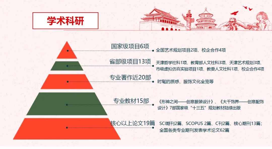 近五年,服装艺术系教师主持完成及在研的国家级项目6项,省部级13项;专业著作近20部、《服饰文化全览》荣获天津市第十二届社会科学优秀成果三等奖。近期学校启动的青年教师“青蓝”工程,制定了培养青年教师的政策计划、探索深化教师队伍建设改革的新路径,这让服装艺术系这支平均年龄37岁的青年队伍心潮澎湃,学校进一步助推了大家科研教学水平的提高,让科研有力地支撑教学,研教结合,将科研精神融入教学体系。
