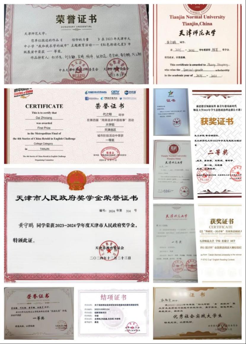 曾获校级特等奖学金、校级一等奖学金、天津市人民政府奖学金、校级三好学生、校级优秀学生干部、校级优秀共青团干部等荣誉;在思想政治理论课公开课大赛中获校级二等奖,主持中国国际大学生创新大赛项目获校级三等奖。现已保送大连理工大学马克思主义学院党的建设方向研究生。